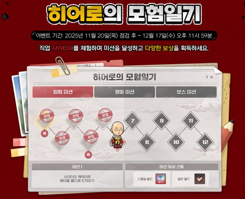 예를 들어, 히어로의 모험 일기 미션을 완료하면 사이타마의 특별 보상을 받을 수 있습니다.